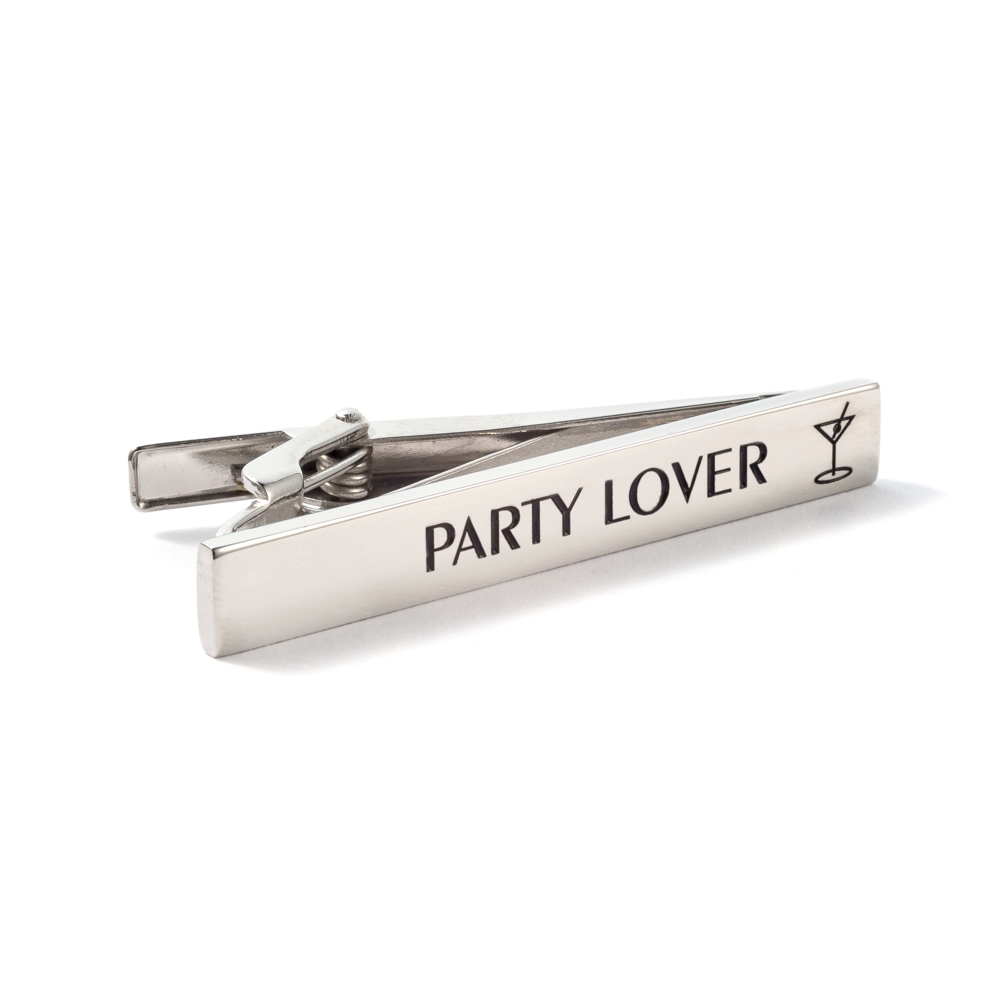 Fermacravatte con scritta incisa “party lover”, un accessorio sfizioso e divertente per gli amanti del glamour . Gioca con gli accessori  e rifinisci il tuo look,  una camicia, una cravatta e l’accessorio giusto! Prodotto Made in Italy, fatto in ottone e venduto con la confezione MON ART FIRENZE inclusa.